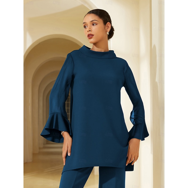 Women's Navy Blue Chiffon Modal Matching Set Blouse Bell Bottom Pants Elegant Stylish Comfortable Daily Work Evening Wear Fall 6