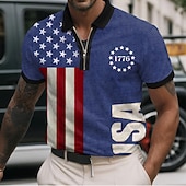 HOT ! Independence Day Men's American US Flag Zip Polo Short Sleeve Polo Shirts Turndown Casual Daily Casual Zip Up 3D Print Summer Blue