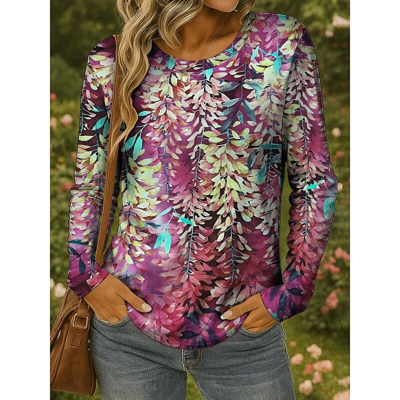 Women's T shirt Crew Neck Long Sleeve Tunic Floral Graphic Plants Vintage Stylish Classic  Round Neck Regular Tops Daily Print Yellow Red Blue Purple Green Fall 12