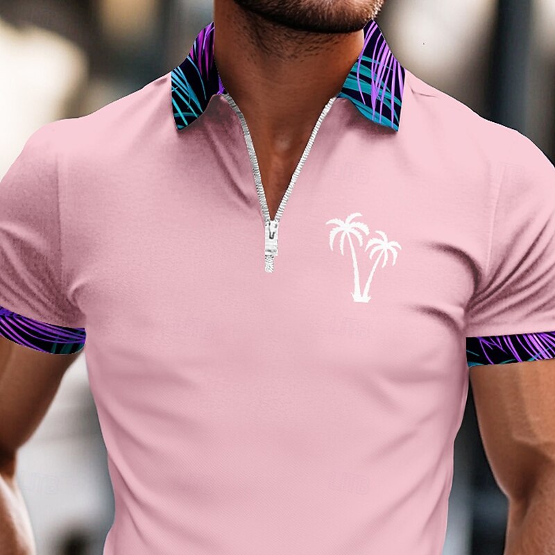 Men's Palm Tree Zip Polo Short Sleeve Turndown Vacation Casual Daily Sports & Outdoor Athleisure Casual Daily Zipper Summer Amethyst Pink Black 7
