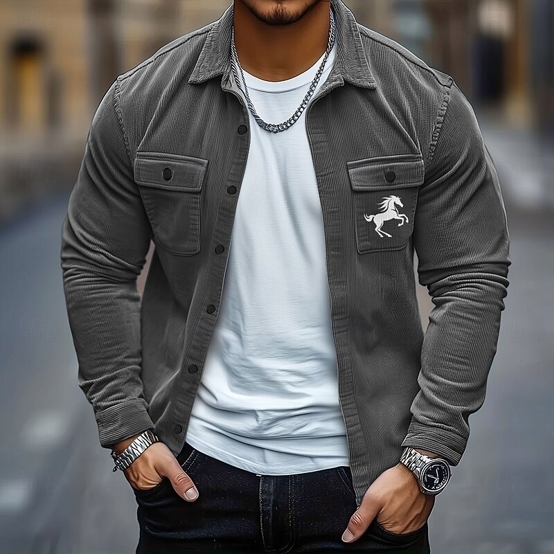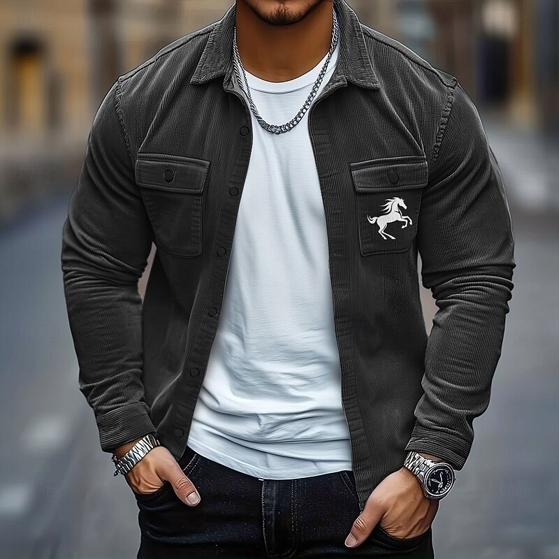 HOT ! Men's Animal Horse Corduroy Shirt Shirt Jacket Overshirt Long Sleeve Casual Outdoor Dailywear Fall Winter Turndown Button-Down Warm Jacket with Flap Pockets Black Blue Green Khaki Gray