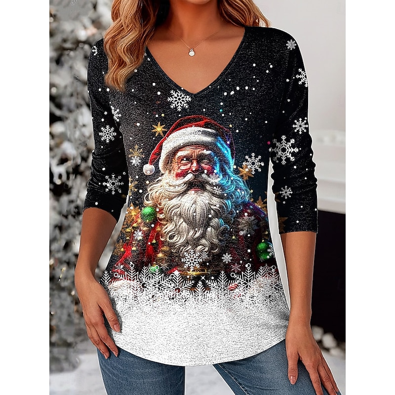 Christmas Women's T Shirt Graphic Snowman Christmas Tree Vintage Stylish Classic Long Sleeve V Neck Regular Tops Daily Print White / Black Black+White+Red Black Wine Red Spring Fall Winter 14