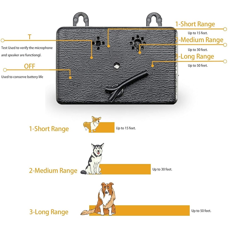 Highlights 【 HUMAN & PETS SAFE】: Safe to your dogs of any size, other pets, plants, and of course yourself and your loved ones. 【NEW TECH】: Stop excessive, noisy dog barking by emitting an ultrasonic sound to silence the dog. More effective than old version deterrents and waterproof. 【SUPER CUTE MINI DESIGN】: The New Bark Controller come with a well-designed mini shape. Designed for easy hanging/mounting on a tree, wall or fence post to stop any dogs barking (within range). 【HIGHLY FUNCTION】: Contain sensitive microphone isolates and picks up barking up to 50 feet away to stop barking both outdoors and indoors (recommended starting mode for indoors is level 1, increase if needed). NOTE: Does not work on deaf or hearing impaired dogs. Tips: In order to ensure the normal use of the dog trainer, please use it after charging. Please unplug the power supply in time after charging.