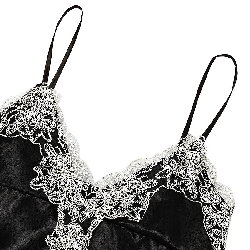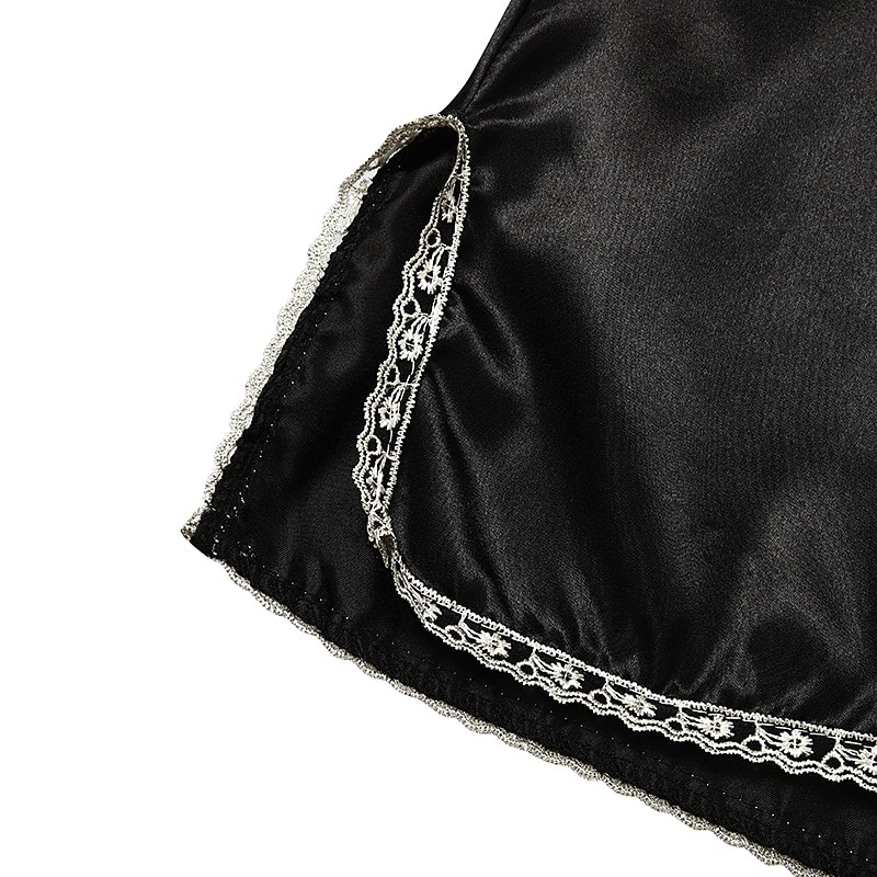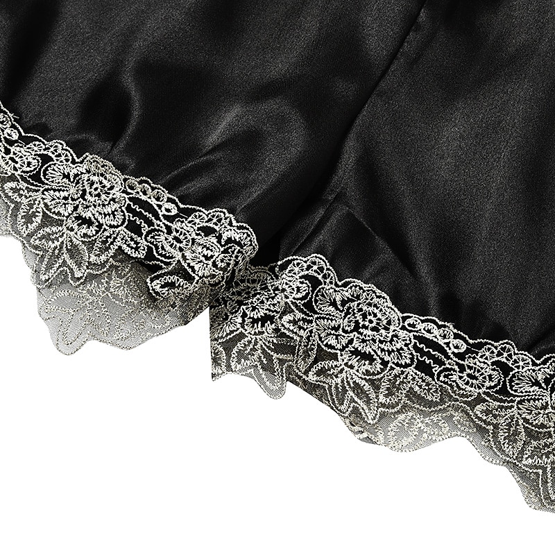 : The set features elegant lace detailing in contrasting colors to enhance its retro and fashionable appeal. The robe and camisole are adorned with lace trimmings, while the slip dress includes lace accents along the neckline. Both the pants and shorts feature lace detailing at the hem, bringing a cohesive and sophisticated look to the ensemble.