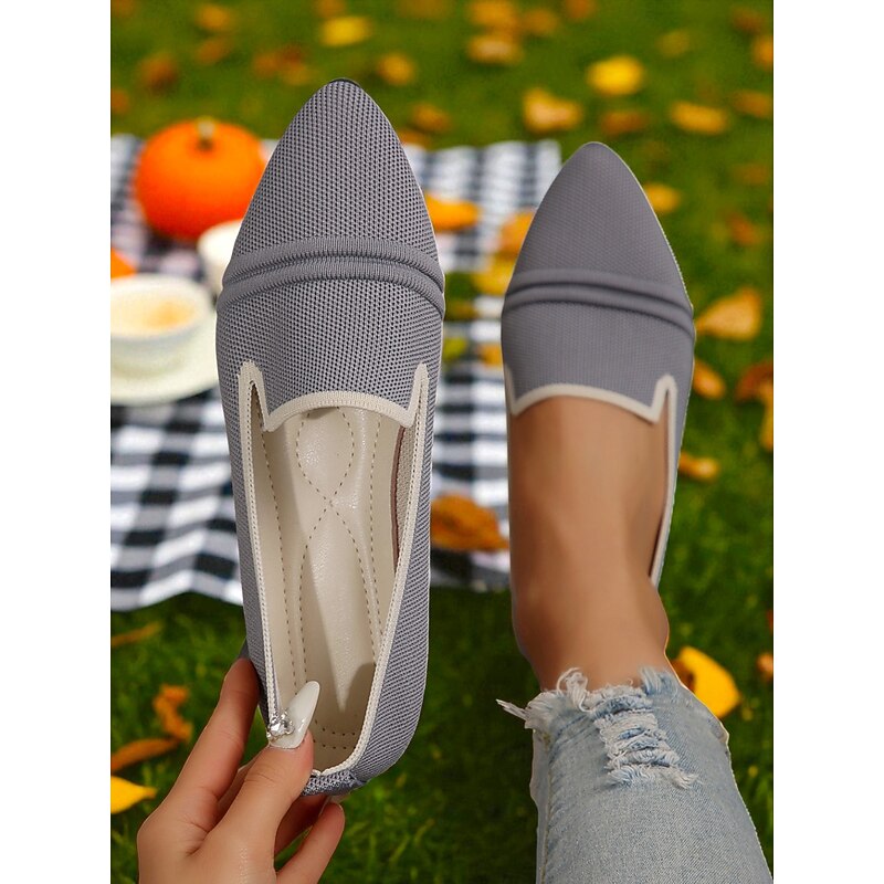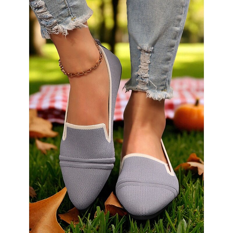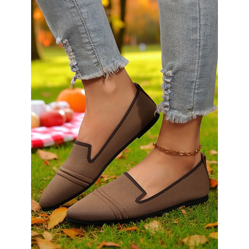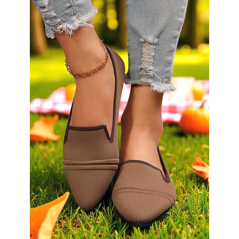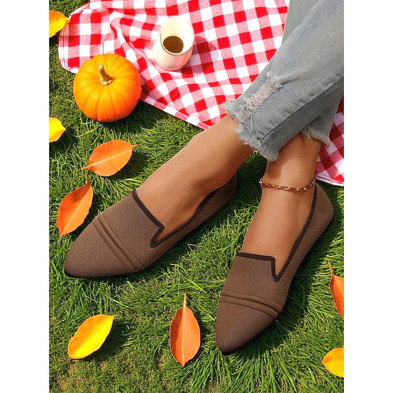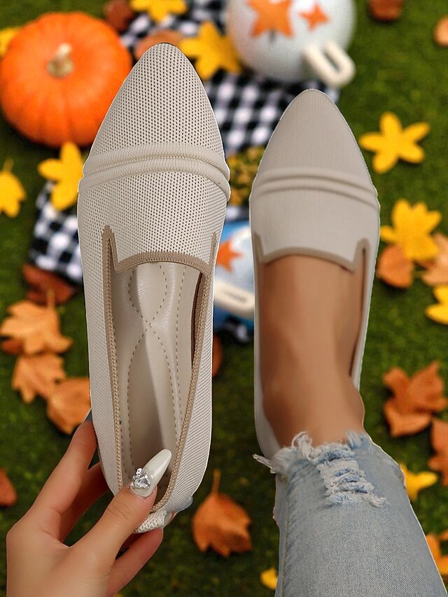 HOT ! Women's Beige Flyknit Flats with Pointed Toe – Lightweight Casual Slip-On Flats for Fall Picnics, Pumpkin Patches and Weekend Coffee Runs