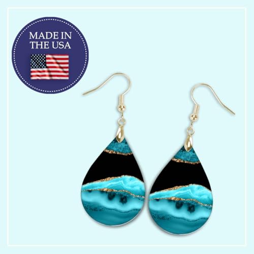 HOT ! Teal Earrings for Women Dangling Trendy Aqua Jewelry Lightweight Teardrop Handmade from The Painted Pug (Teal Gold & Black)