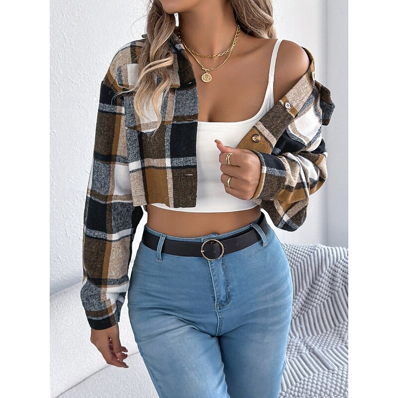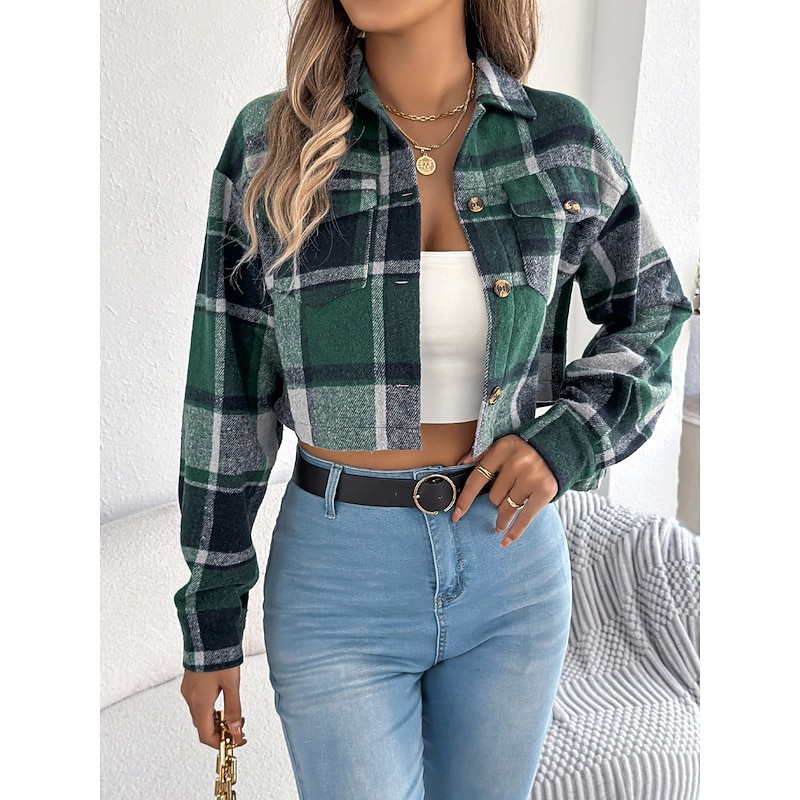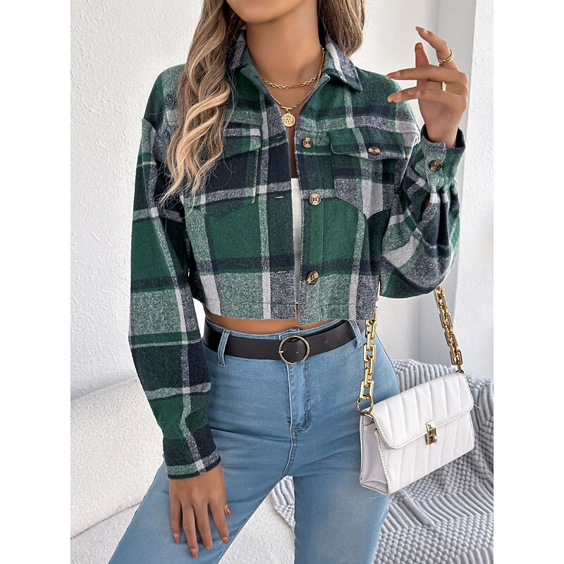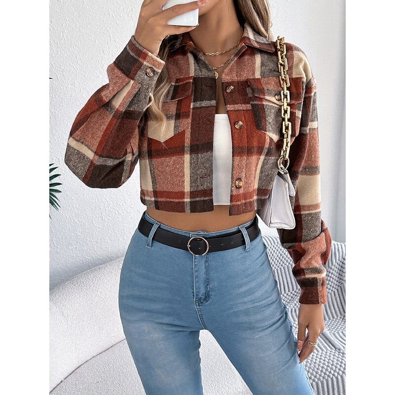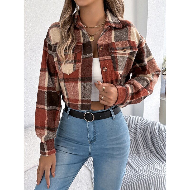 Women's Casual Jacket Shacket Comfortable Breathable Pocket Buttons Print Casual Plaid Vacation Street Casual Daily Wear Single Breasted Short Turndown Regular Fit Long Sleeve Outerwear Orange Green 18