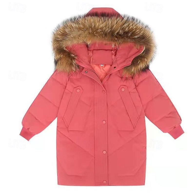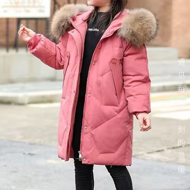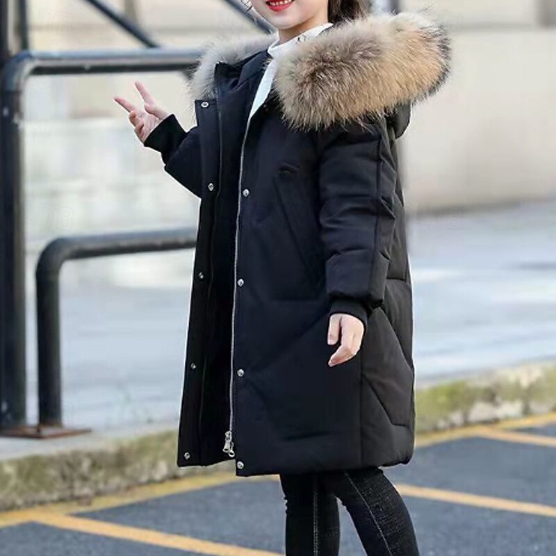 HOT ! Kids Girls' Down Coat Solid Color Fashion Fur Trim Zipper Pocket School Cotton Coat Outerwear 4-12 Years Winter Black Pink Red