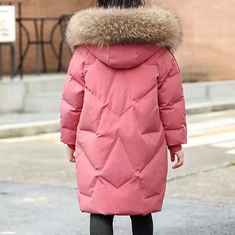 Kids Girls' Down Coat Solid Color Fashion Fur Trim Zipper Pocket School Cotton Coat Outerwear 4-12 Years Winter Black Pink Red 17