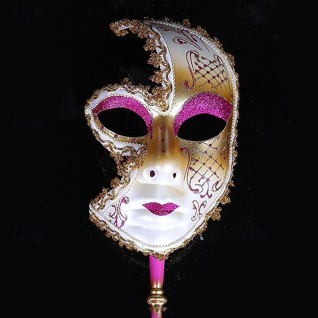Highlights [Title] : Arlecchina Carnival Mask - Venetian Half-Face Mask on a Stick for Adults [Fabric] : Crafted from lightweight and durable plastics, this Venetian-style mask offers both comfort and longevity, ensuring it can be worn for extended periods without discomfort. [Design] : The mask features a stunning combination of gold and white hues with intricate patterns and glittering pink accents. Detailed gold trims embellish the edges, enhancing its luxurious appeal. The eye area is accentuated with dazzling pink glitter for a truly captivating look. [Design Highlights] : This mask is equipped with an ornate stick handle, allowing for a sophisticated and effortless way to hold the mask during events. The intricate patterns and glittering accents offer a modern yet traditional Venetian vibe, perfect for standing out during any occasion. [Occasions] : Ideal for masquerade balls, theatrical events, Halloween, Carnival, and Mardi Gras celebrations, this mask adds a touch of mystique and elegance to any event. It's perfect for performances and parties, making it a versatile choice for various festive occasions. [Size] : Available in a convenient one-size design, this mask is suitable for both women and men, ensuring it accommodates a wide range of adult wearers comfortably.