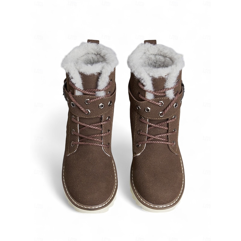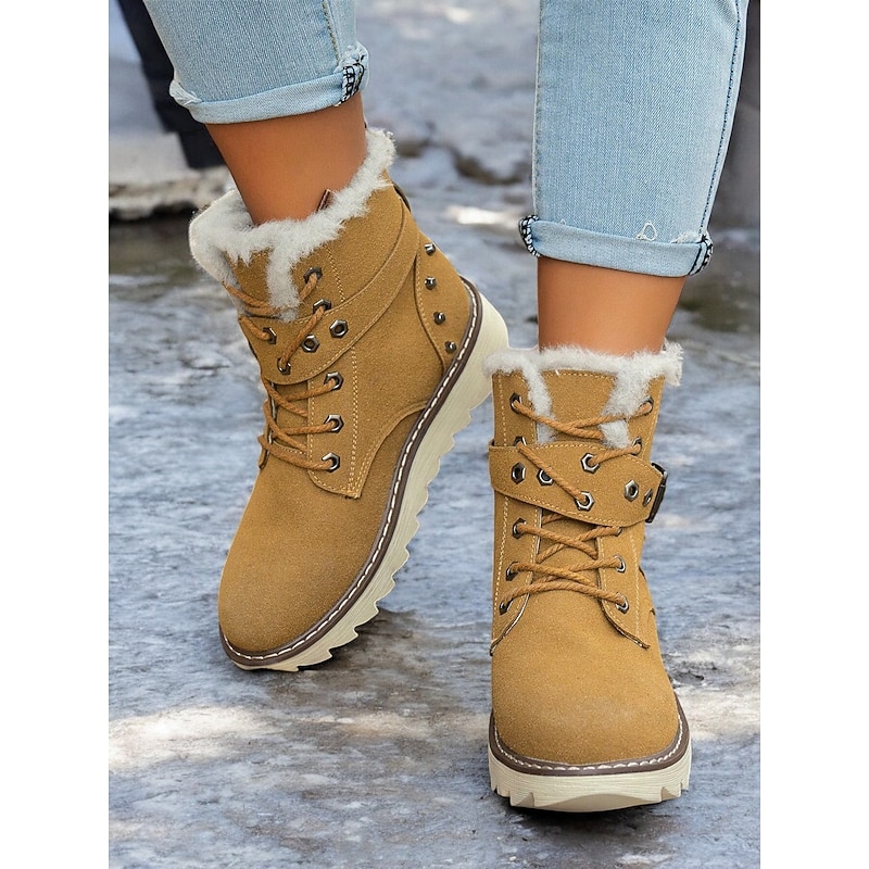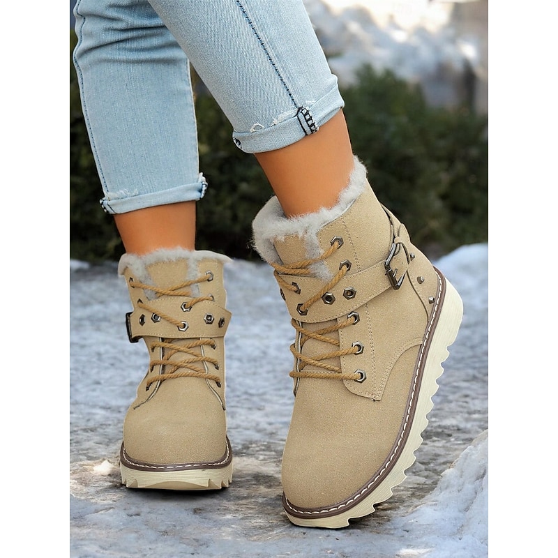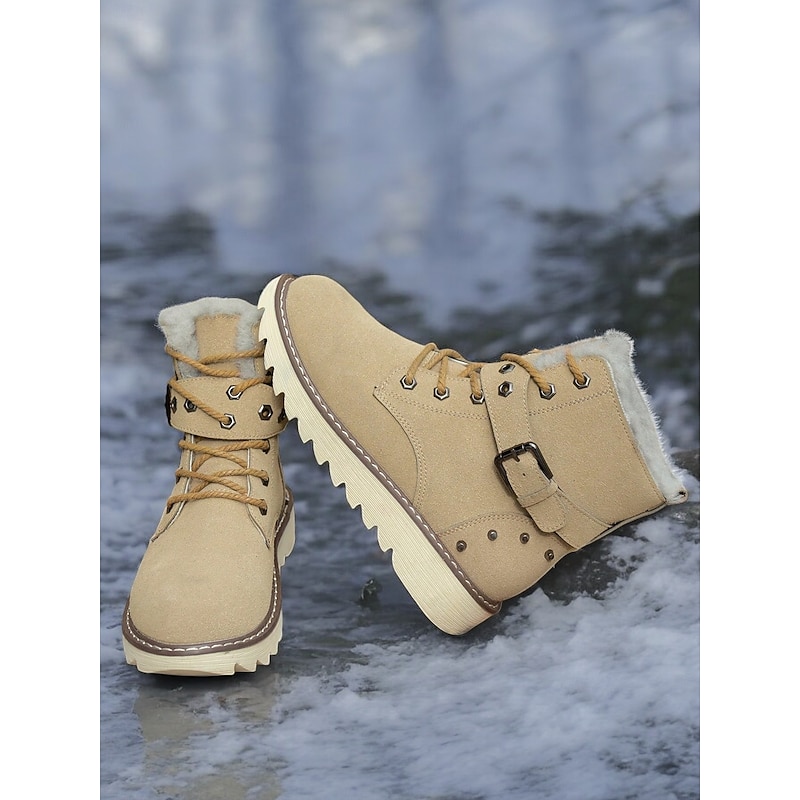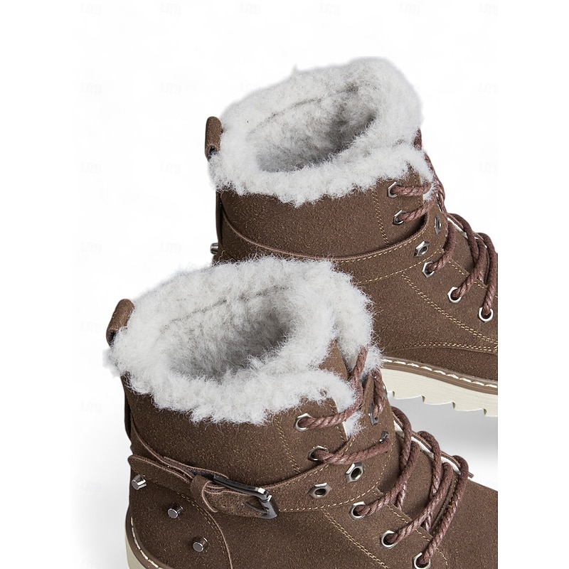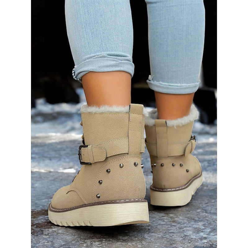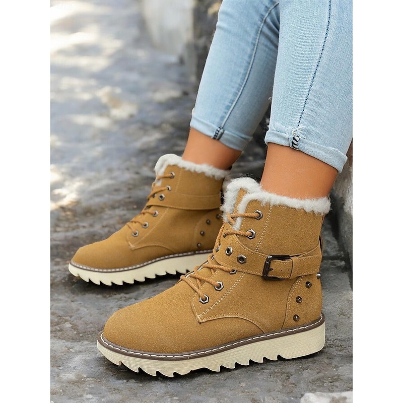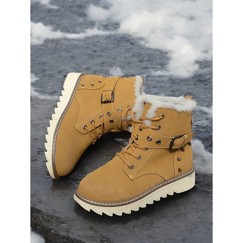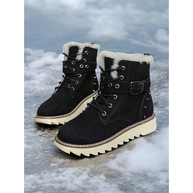 Highlights [Fabric] These sophisticated winter snow boots are crafted with faux suede, offering a luxuriously soft feel and a stylish appearance. The interior boasts a plush faux fur lining that provides excellent insulation, ensuring your feet stay warm and cozy even in the harshest winter conditions. [Fit] Designed with a comfortable flat heel and a round toe shape, these boots offer a relaxed fit that is perfect for all-day wear. The mid-calf length provides additional coverage and protection against the cold, making them a reliable choice for snowy and icy environments. [Design Highlights] The boots feature a classic lace-up closure complemented by an elegant leather strap and metal buckle detail around the ankle. This modern embellishment, alongside contrast-stitched detailing and rivets, adds a touch of sophistication and contemporary flair to the overall design. [Occasions] Ideal for both casual wear and outdoor winter activities, these boots are perfect for daily wear during the colder months. Whether you're heading out for a brisk walk or attending a casual social gathering, these boots ensure style and comfort no matter the occasion. [Size Range] Available in a wide range of sizes, from US6 to US10.5, these boots cater to various foot sizes, ensuring a perfect fit for everyone. Suitable for fall and winter seasons, they align with the latest 2024 snow boots trends.