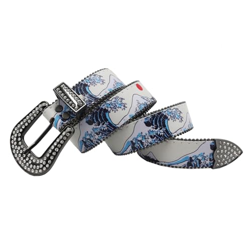 • 【Bold Western Street Style】Features a red sun snow mountain print strap with rivet studs and a shining rhinestones buckle, blending cowboy aesthetics with hip-hop edge for standout appeal.