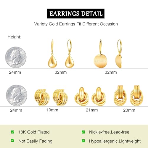 • 5-pairs Gold Earring Set: You will get dainty gold earrings featuring trending designs: teardrop leverback earrings, disc dangle Earrings, gold drop earrings, gold knot earrings and gold stud earrings. Every earing is thoughtfully coordinated to refresh your jewelry rotation effortlessly.
