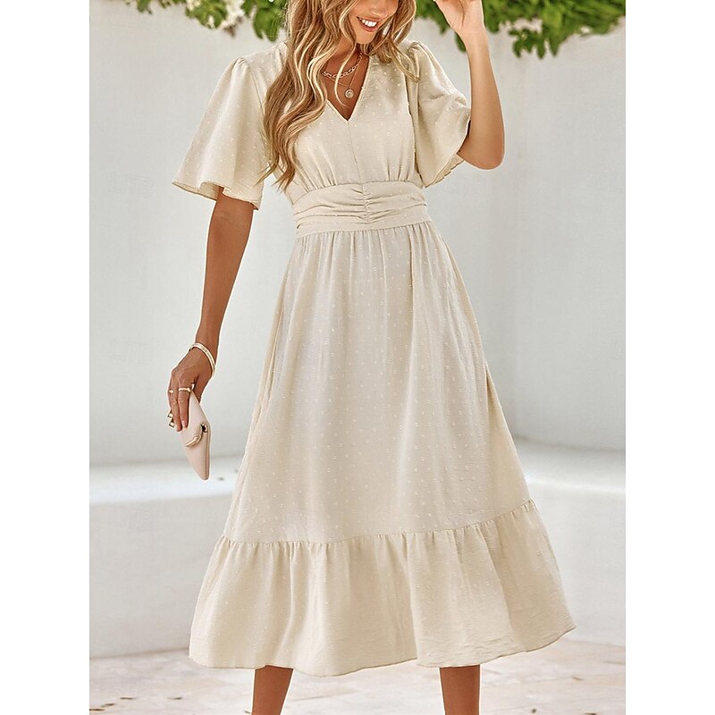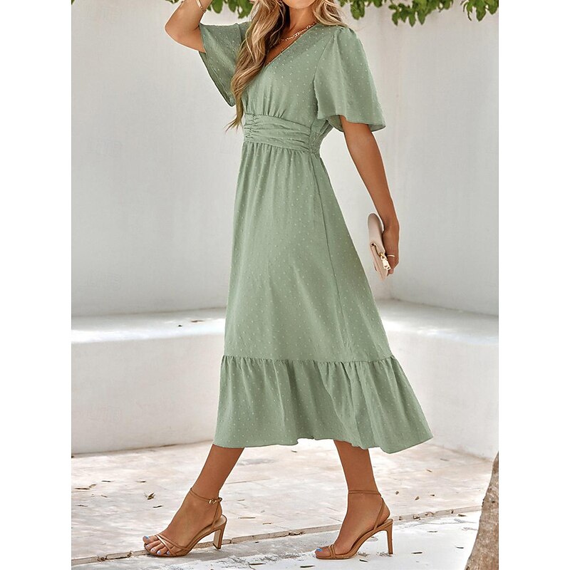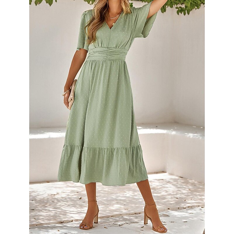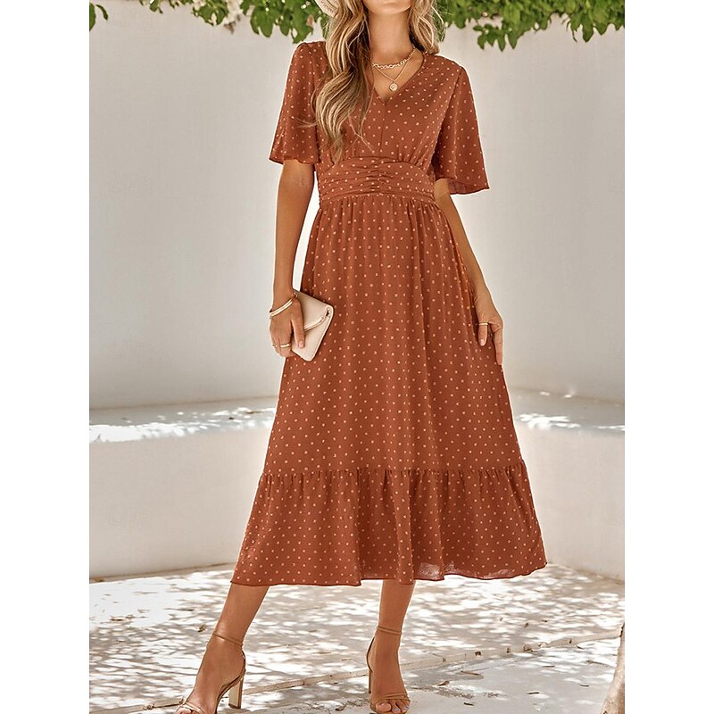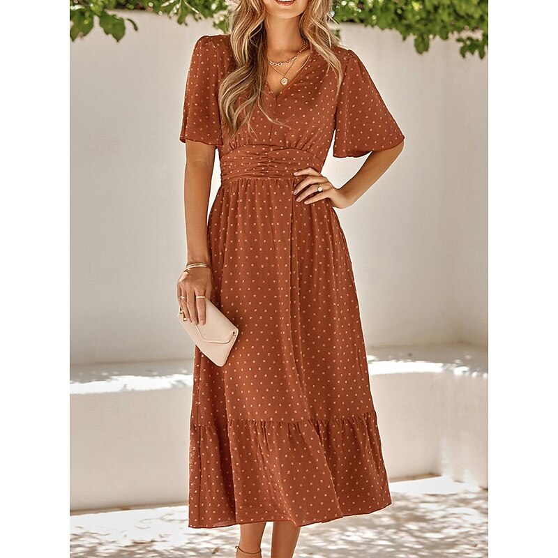 Highlights [Fabric and Style] : This women's casual dress is crafted from high-quality polyester with a micro-elastic feel, ensuring comfort and mobility. The dress is designed in a versatile A-line silhouette that offers a flattering fit for various body types. [Design Highlights] : The dress features an elegant V-neck and half sleeves, with a fitted waist that enhances the figure. The flowing skirt is finished with a charming ruffle trim, adding a touch of femininity and sophistication. The midi-length design provides a balanced look suitable for multiple settings. [Occasions] : This stylish dress is perfect for a range of occasions, including dates, vacations, street outings, and holidays. Its casual yet elegant design makes it an ideal choice for summer events, ensuring both comfort and style. [Size Range] : Available in sizes S, M, L, and XL, this dress caters to a broad size range, providing a relaxed yet flattering fit for different body types. [Color Options] : Choose from an earthy brown, refreshing green, or soft apricot color to best suit your personal style and preferences.