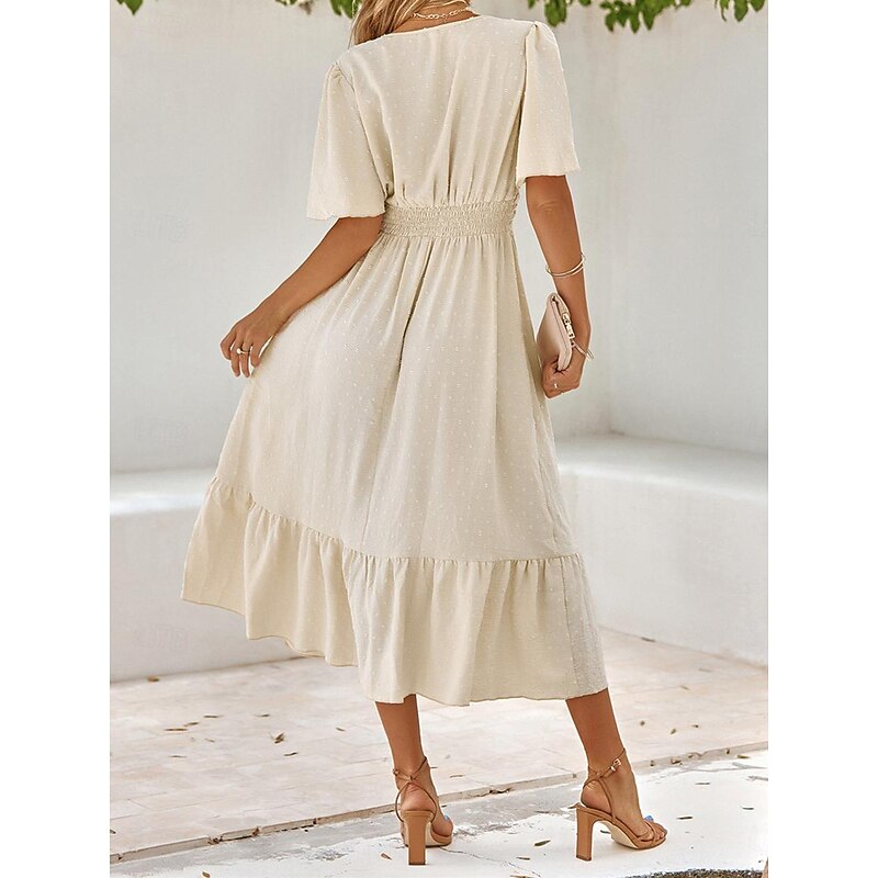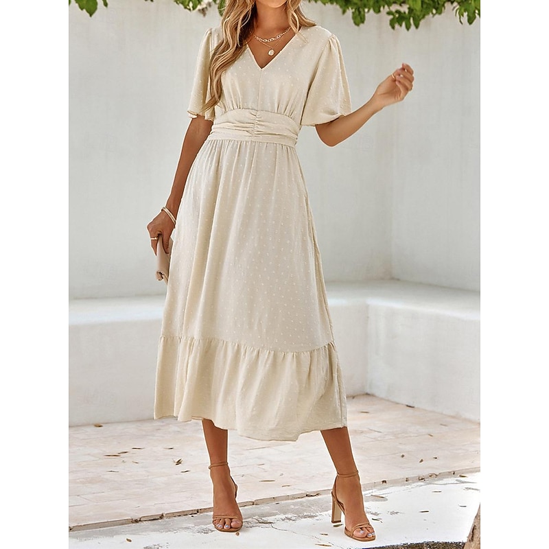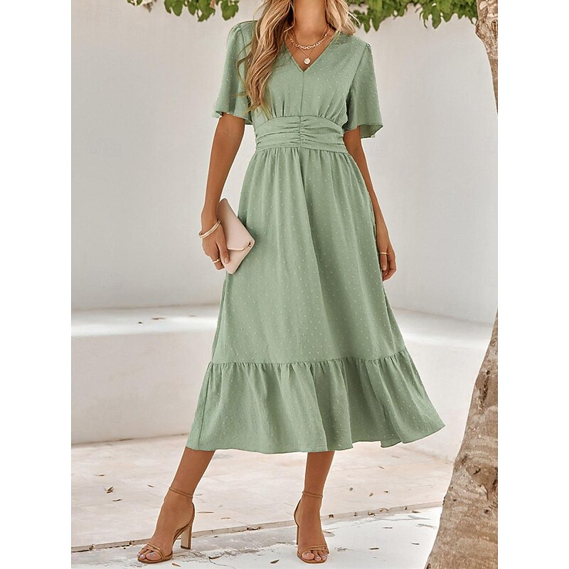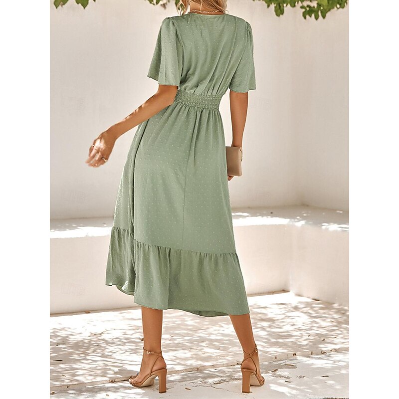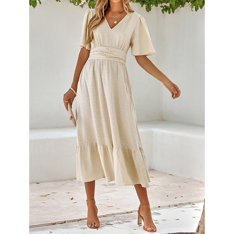 Highlights [Fabric and Style] : This women's casual dress is crafted from high-quality polyester with a micro-elastic feel, ensuring comfort and mobility. The dress is designed in a versatile A-line silhouette that offers a flattering fit for various body types. [Design Highlights] : The dress features an elegant V-neck and half sleeves, with a fitted waist that enhances the figure. The flowing skirt is finished with a charming ruffle trim, adding a touch of femininity and sophistication. The midi-length design provides a balanced look suitable for multiple settings. [Occasions] : This stylish dress is perfect for a range of occasions, including dates, vacations, street outings, and holidays. Its casual yet elegant design makes it an ideal choice for summer events, ensuring both comfort and style. [Size Range] : Available in sizes S, M, L, and XL, this dress caters to a broad size range, providing a relaxed yet flattering fit for different body types. [Color Options] : Choose from an earthy brown, refreshing green, or soft apricot color to best suit your personal style and preferences.