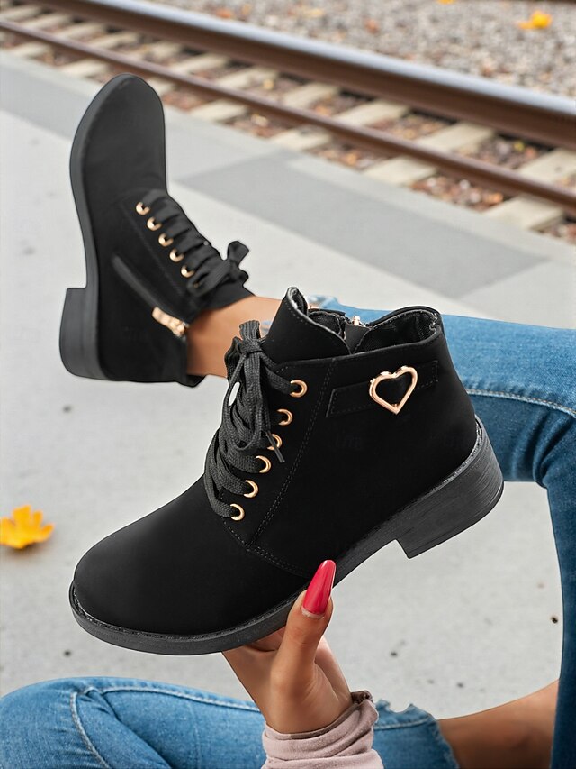Women's Black Ankle Boots – Lace-Up Short Boots with Heart Buckle for Casual Outfits and Streetwear 1