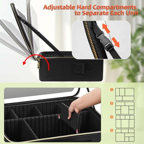 Large Travel Makeup Bag with LED Mirror, 3-Color Stepless Dimming Stand Mirror Detachable, with Adjustable Divider, Makeup Brush Holder Storage (Black) 1