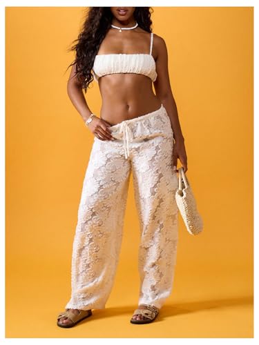 HOT ! Women's Floral Textured Lace Pants Y2k Sheer Mesh Drawstring Waist Wide Leg Lounge Pants Casual