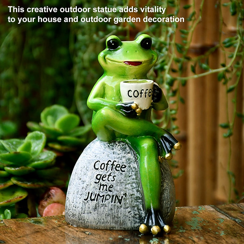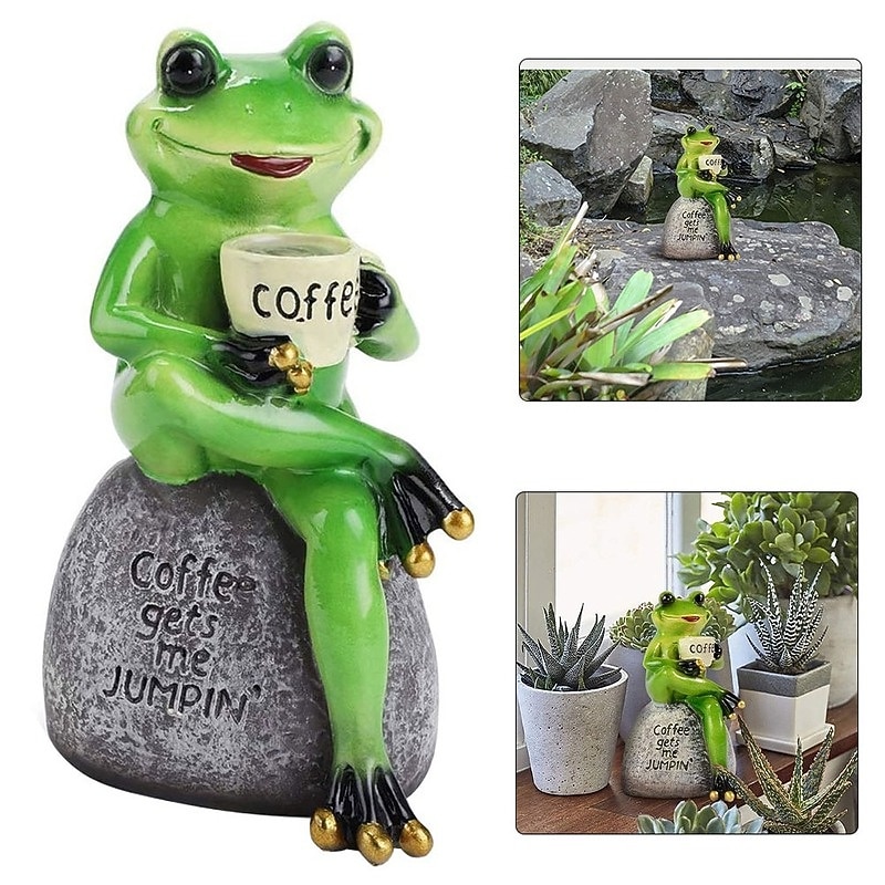 1. Add a touch of liveliness to your yard with this delightful green frog ornament! Featuring a charming frog adorably holding a cup of coffee while sitting on a stone, this creative decoration is sure to bring a smile to your face.