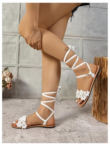 GORGLITTER Women's Flower Lace Up Sandals Floral Open Toe Strappy Tie Up Flat Sandals 6