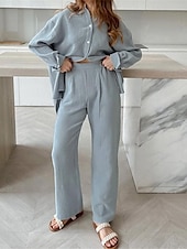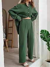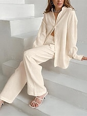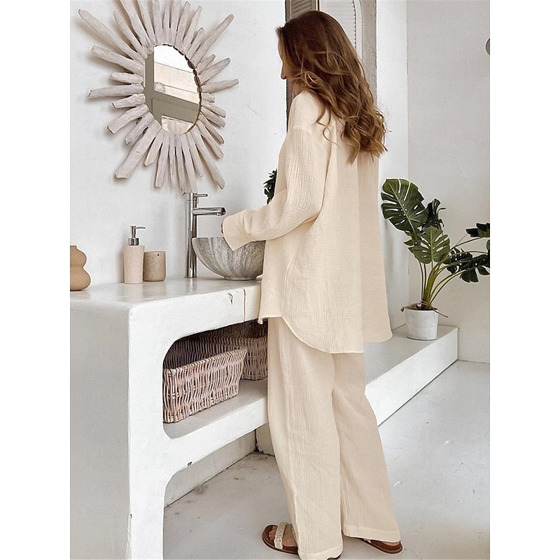 More information about Women's Loungewear Sets Pure Color Simple Basic Street Daily Cotton And Linen Breathable Lapel Long Sleeve Shirt Pant Button Summer Spring Home Outfits