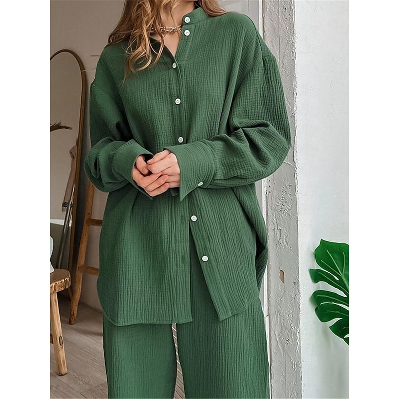 Highlights [Fabric] : Crafted from a breathable blend of cotton and linen, this loungewear set is perfect for staying cool and comfortable during the warmer spring and summer months. The lightweight fabric with a slight crinkle texture offers both softness and visual appeal, ensuring a relaxing experience. [Fit] : Designed with a loose-fitting silhouette, this women’s loungewear set allows for easy movement and a relaxed, comfortable fit. The top features long sleeves and a casual lapel neckline, while the pants include an elastic waistband and long legs for additional comfort and flexibility. [Design Highlights] : The top showcases a button-up front with a classic lapel collar, adding a touch of sophistication to the overall basic style. The pure color pattern and simple design make it versatile and easy to pair with various accessories, perfect for everyday wear. [Occasions] : Ideal for street style and daily outings, as well as lounging at home. Whether you're going for a walk, running errands, or simply relaxing, this set is functional and stylish for any casual occasion. [Size Range] : Available in a wide range of sizes, from S to 3XL, accommodating different body types and preferences. The set is offered in neutral colors like Beige, Gray, and Army Green to suit various style choices.