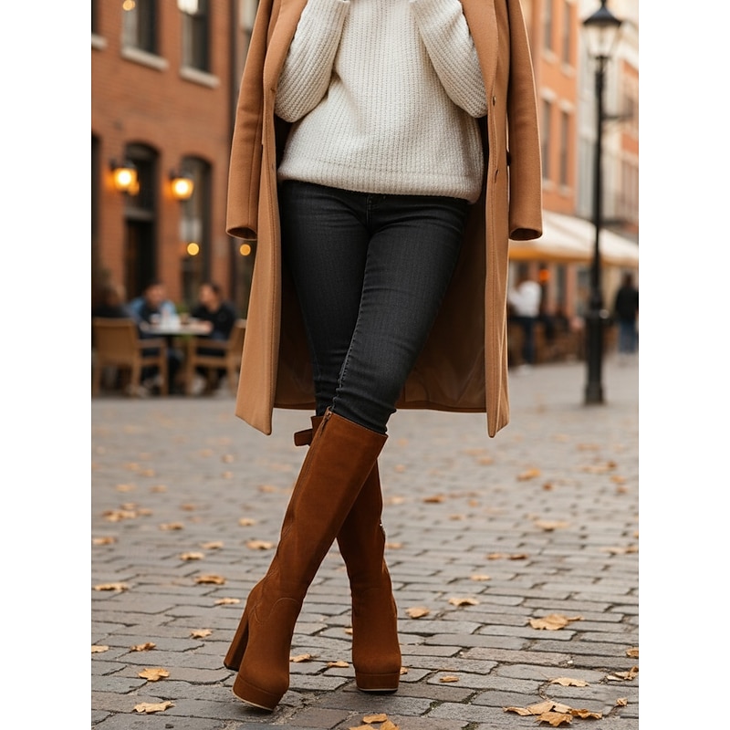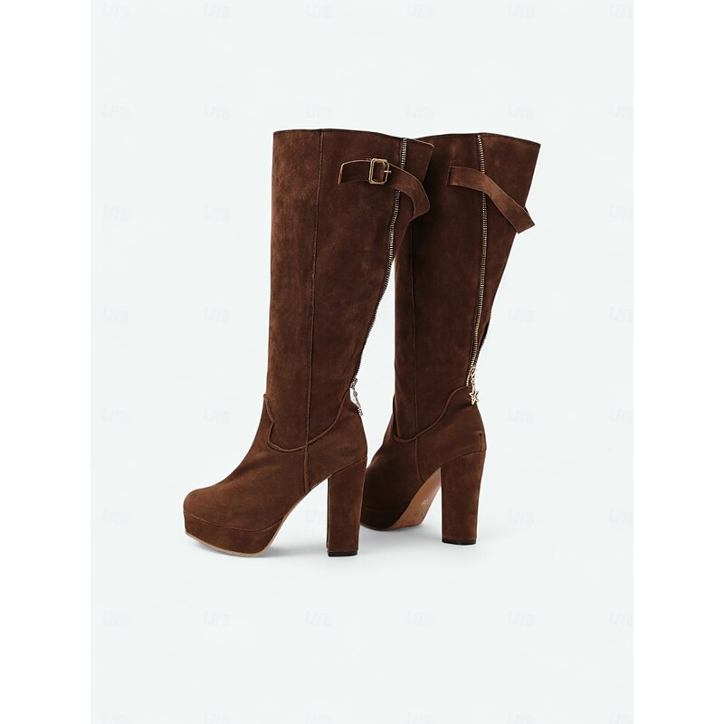 Women's Suede Knee High Platform Boots with Adjustable Wide Zipper Calf, Block Heel Fashion Boots for Urban Streetwear 25