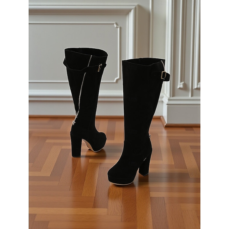 Women's Suede Knee High Platform Boots with Adjustable Wide Zipper Calf, Block Heel Fashion Boots for Urban Streetwear 24