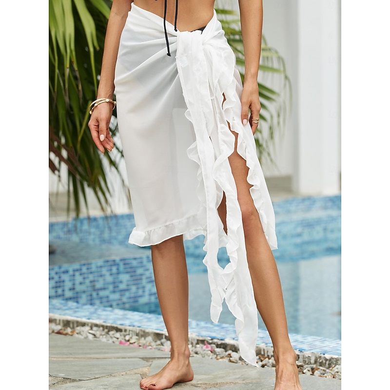 Highlights [Fabric & Material] : Crafted from a lightweight and breathable polyester, this women's swimwear cover-up ensures you stay cool and comfortable during your beach outings. The micro-elastic properties of the fabric provide just the right amount of stretch for ease of movement. [Fit & Style] : Designed for a regular fit, this chic sarong wrap skirt enhances your beachwear ensemble with its elegant and versatile style. It embodies a sexy and modern boho look, making it perfect for holiday adventures. [Design Highlights] : The sarong wrap skirt features an asymmetric design with a high slit that adds a touch of sophistication and allure. Delicate ruffles along the wrap line offer a playful yet refined edge, making it a standout piece for any summer occasion. [Occasions] : Ideal for vacations, holidays, swimming, and other summer activities, this cover-up is a versatile addition to your wardrobe, effortlessly combining comfort with fashionable flair. [Size Information] : Available in a convenient one-size-fits-most design, this swimwear cover-up caters to a variety of body types, providing ease and adaptability.