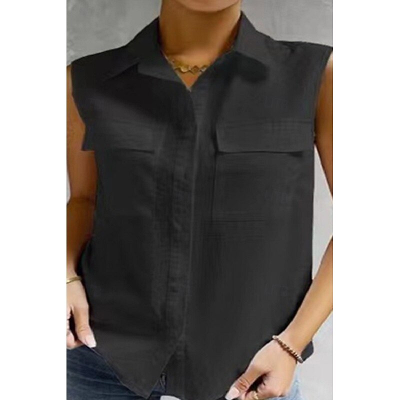 Women's Shirt Button Up Blouse Plain Basic Modern Casual Sleeveless Shirt Collar Regular Tops Daily Going out Buttons Pocket Black White Light Blue Summer 1