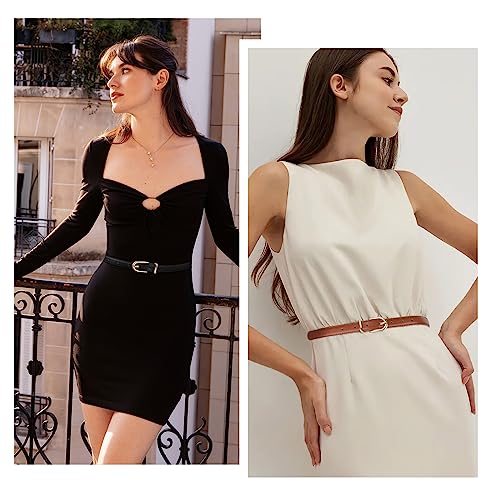 • Women’s Thin Leather Belt: Featuring a sleek gold curved metal buckle with a single prong, this women slim leather belt combines a classic color palette with a minimalist design, making it a prope lightweight accessory. The subtle metallic sheen effortlessly elevates dresses and tunics, adding a polished touch to your outfit. Suitable for everyday wear!