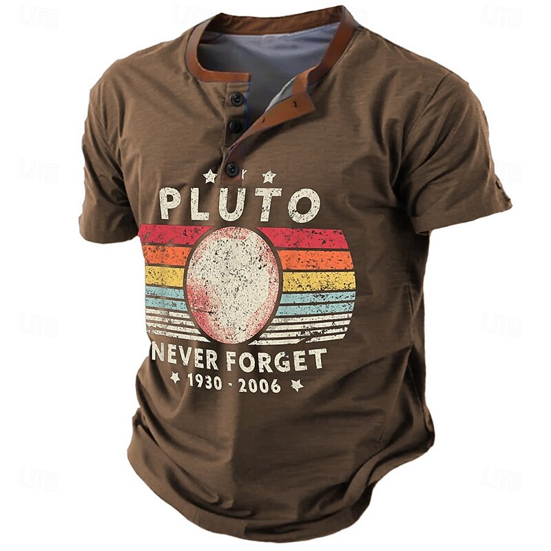 Men's Henley T-Shirt Pluto not once Forget 1930-2006 Vintage Graphic Short Sleeve Brown