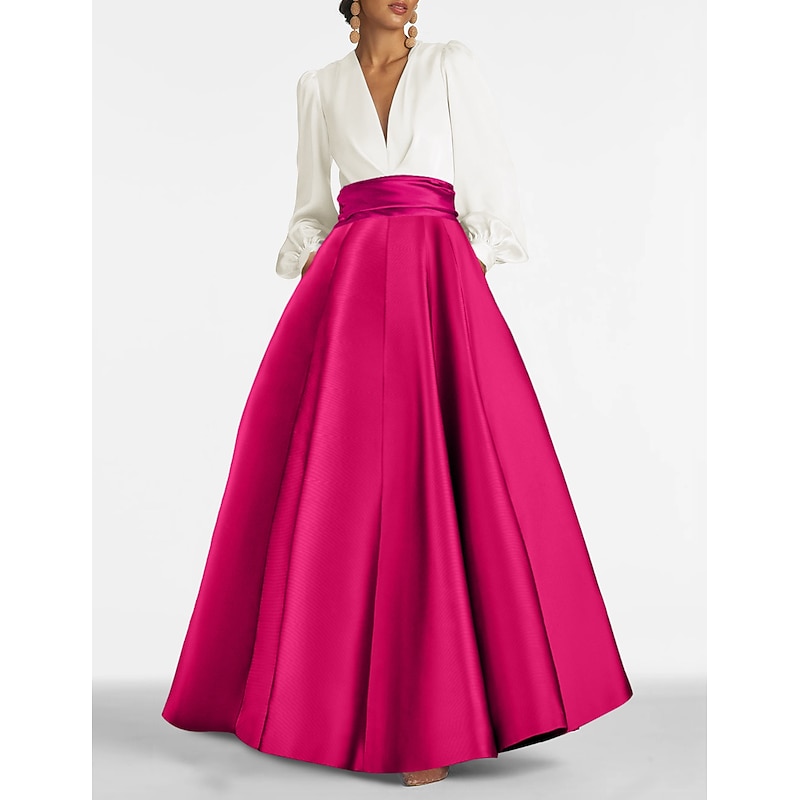 Highlights [Fabric] Crafted from luxurious satin, this evening gown offers a silky texture and subtle sheen, providing both comfort and elegance. The high-quality fabric ensures a lustrous finish, enhancing the graceful drape of the floor-length skirt. [Silhouette] Designed in a classic A-line shape, this elegant dress features a floor-length hemline that accentuates the silhouette beautifully. The high waist is emphasized with a wide sash, offering a flattering fit that enhances the feminine form. [Design Highlights] The gown showcases a sophisticated two-tone design with a striking contrast between the classic white top and vibrant fuchsia pink skirt. The deep V-neckline is adorned with delicate pleats, while the slightly puffed long sleeves add a touch of vintage charm. A zipper closure ensures a seamless, elegant appearance. [Occasions] Ideal for prom, formal events, and weddings, this evening gown is a standout choice for any special occasion. Its elegant design and vibrant color contrast make it suitable for wedding guests and other formal gatherings, adding charm and style. [Size] Available in a wide range of sizes, this gown accommodates various body types and preferences. From US size 0 to 26W, including custom measurements for a perfect fit, it ensures every woman can find her ideal size.