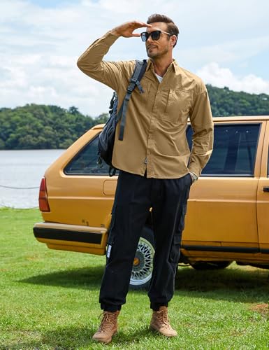 Eisctnd Men's Long Sleeve Tactical Work Shirts, Outdoor Casual Button Down Shirt with Zipper Pockets for Hiking, Safari 6