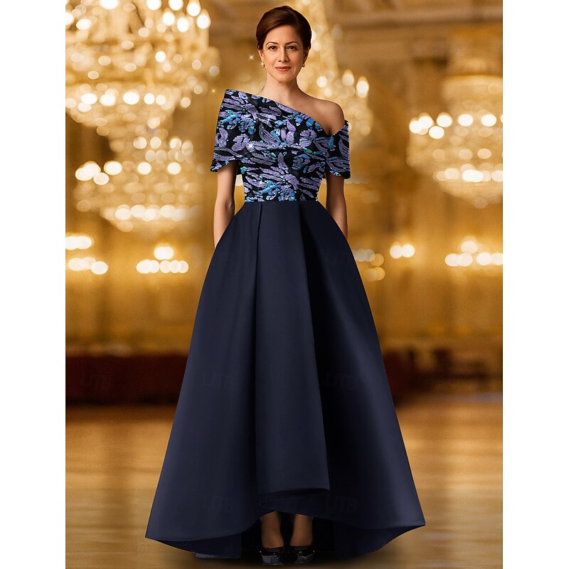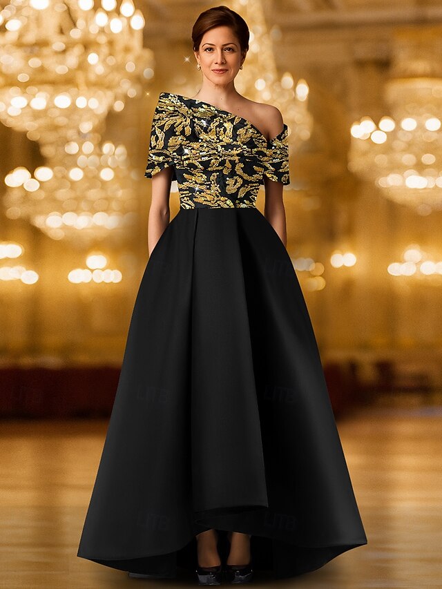 More information about Black Gold Sequined A-Line Evening Gown Elegant Formal Dress Formal Wedding Floor Length One Shoulder Pocket Satin with Glitter Embroidery Shawl 2025
