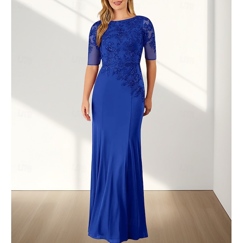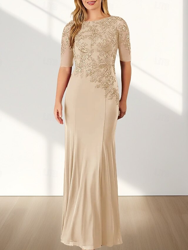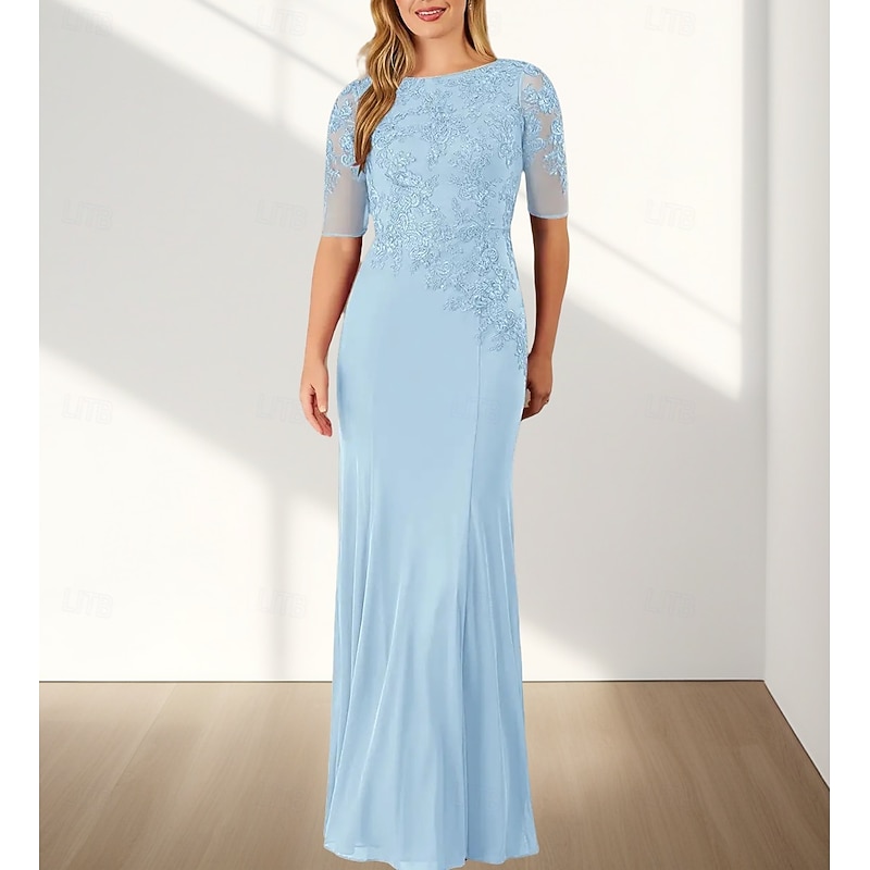 Mermaid / Trumpet Mother of the Bride Dress Wedding Guest Elegant Crew Neck Floor Length Chiffon Half Sleeve with Appliques 25
