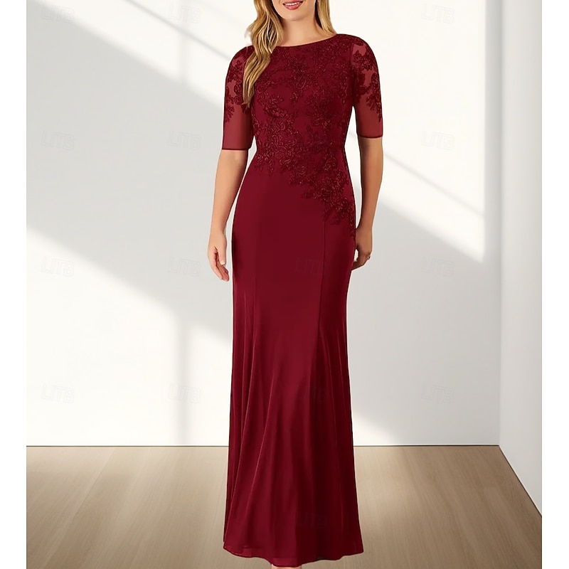 Mermaid / Trumpet Mother of the Bride Dress Wedding Guest Elegant Crew Neck Floor Length Chiffon Half Sleeve with Appliques 19