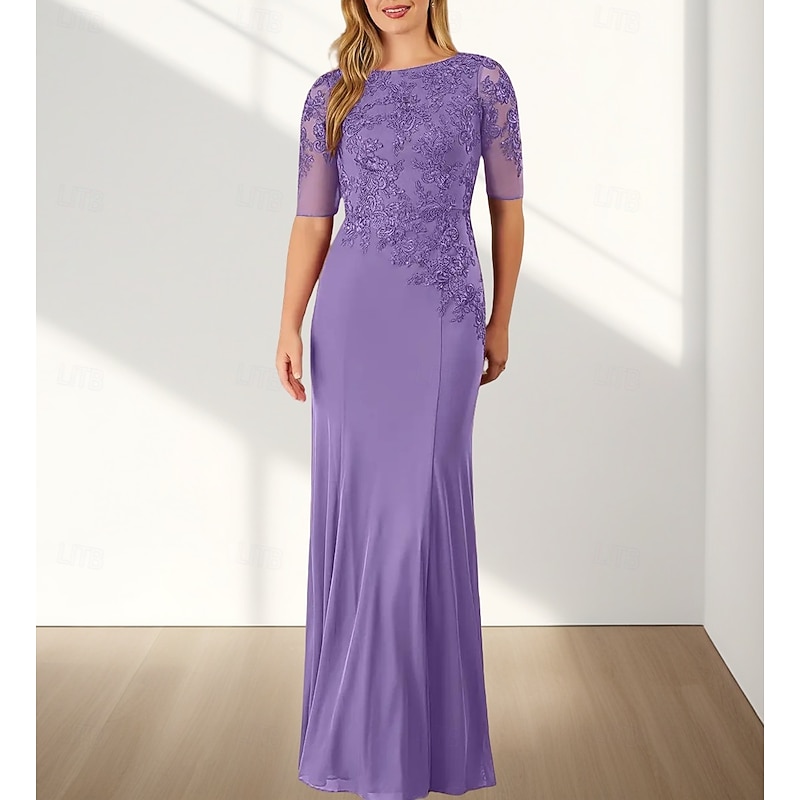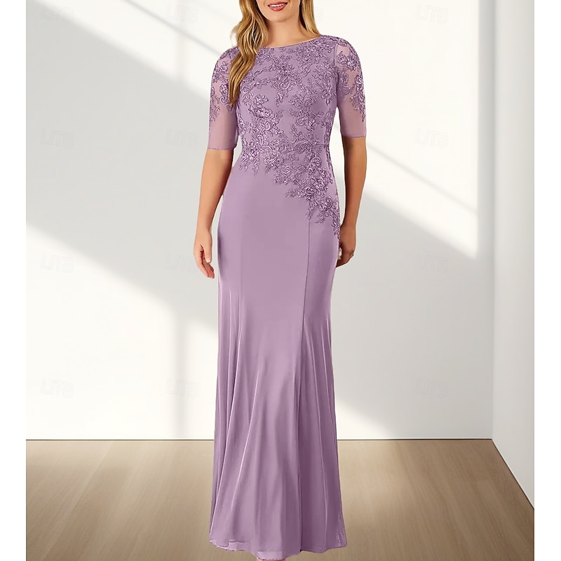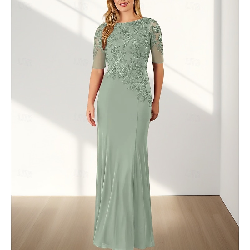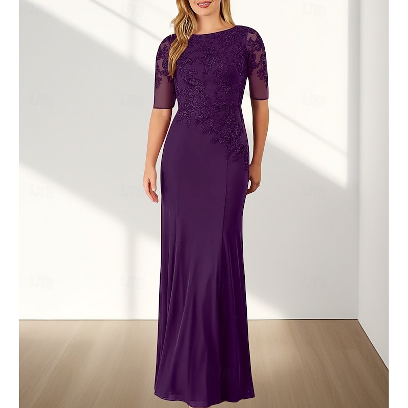 HOT ! Mermaid / Trumpet Mother of the Bride Dress Wedding Guest Elegant Crew Neck Floor Length Chiffon Half Sleeve with Appliques