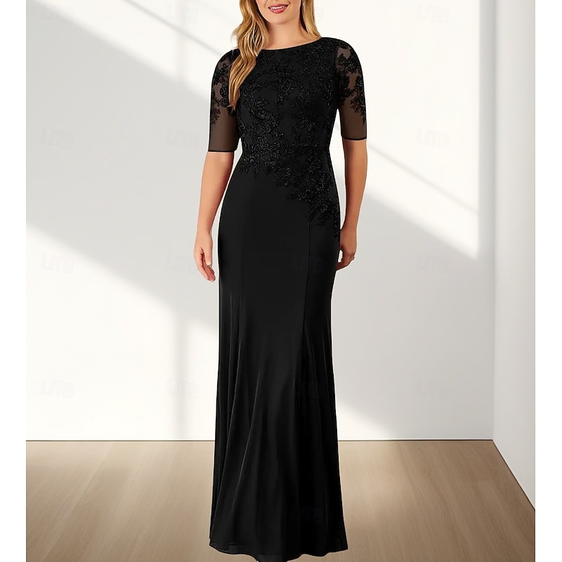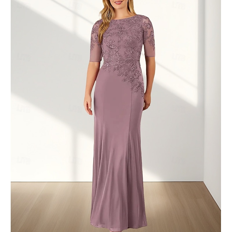 Mermaid / Trumpet Mother of the Bride Dress Wedding Guest Elegant Crew Neck Floor Length Chiffon Half Sleeve with Appliques 1