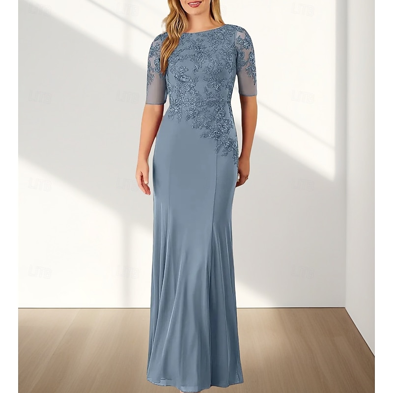 Mermaid / Trumpet Mother of the Bride Dress Wedding Guest Elegant Crew Neck Floor Length Chiffon Half Sleeve with Appliques 29