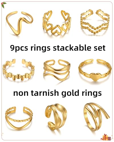 • Gold Rings for Women Non Tarnish: stackable ring design for trendy layering​​. One order mix and match 9 uniquely textured rings to create your signature look. From minimalist to bold, match any outfit or occasion effortlessly.