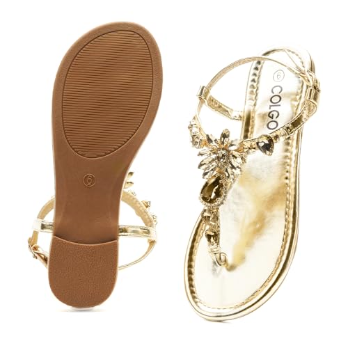 Colgo Women's T-Strap Flat Sandals, Elegant Glitter Rhinestone Thong Dress Shoes, Comfortable Wedding Sandals for Summer Beach Parties 7