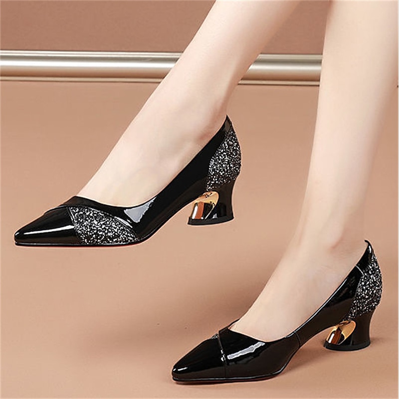 Women's Glitter-Accented Patent Faux Leather Block Heels – Elegant Pointed Toe Pumps for Formal Occasions 1