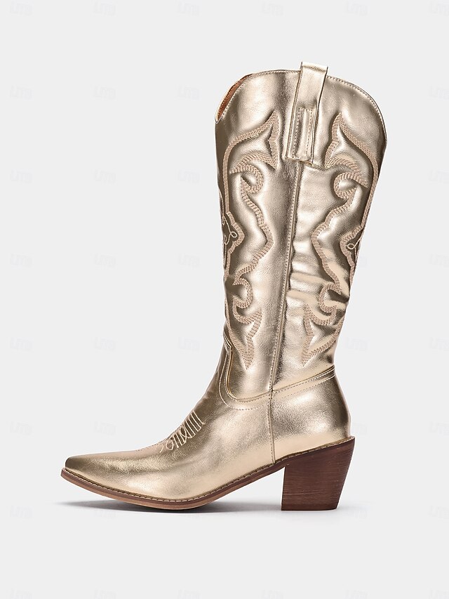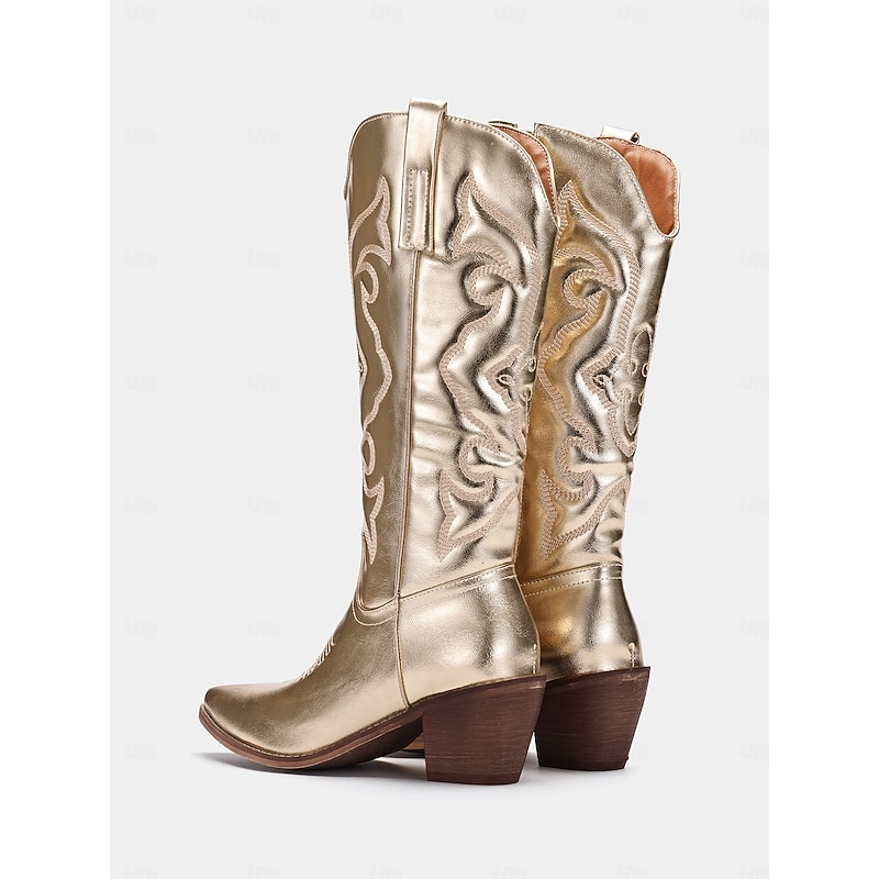 Highlights [Fabric and Material] These Women's Metallic Gold Western Cowboy Boots are crafted from high-quality PU, offering a durable and luxurious appearance. The synthetic leather lining ensures comfort with every step, making them suitable for wear across all seasons including spring, summer, fall, and winter. [Silhouette and Fit] Featuring a classic pointed toe, these mid-calf boots present a traditional Western silhouette. The slip-on loafer style provides convenience, while the sturdy stacked block heel ensures ease of wear, making these boots both functional and fashionable. [Design Highlights] The boots boast a sleek gold metallic finish, accentuated by intricate Western-style embroidery on the shaft. This adds an elegant and unique touch to the overall design, making them a standout addition to any wardrobe. [Occasions] Perfect for parties and various social gatherings, these boots offer a blend of style and practicality. Their glamorous design and comfortable fit make them an ideal choice for both casual and semi-formal events. [Size Notice] Available in sizes ranging from US6 to US10.5, these boots are designed to fit standard sizing. It is recommended to select your usual size for the best fit.