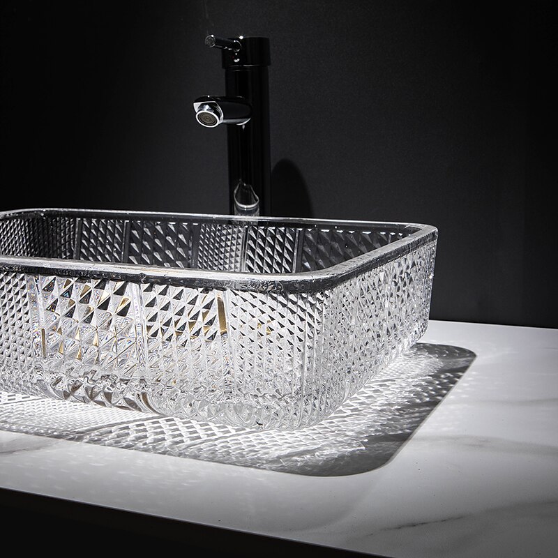 HOT ! The modern light luxury transparent art rectangular die-cast glass wash basin with faucet sink