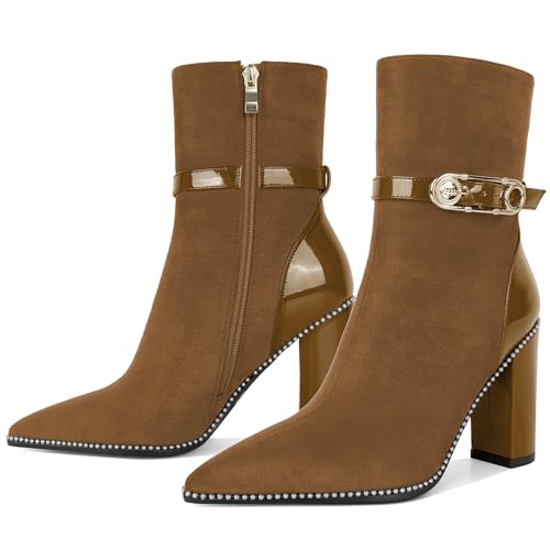 HOT ! Soireelady Womens Ankle Boots Pointed Toe High Heel Beaded Boots Chunky Block Heel Booties with Metal Buckle Side Zipper Short Boots 4 Inch