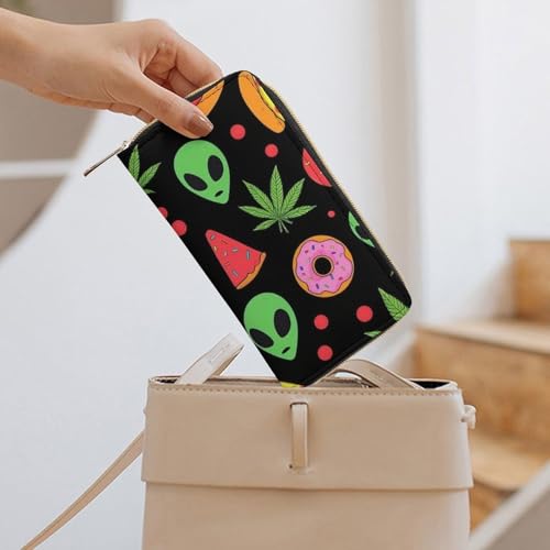 Women's Travel Zipper Purse Fashion Design, Huge Storage Capacity Purse, Cute Decor Wallet, Long PU Wallet Alien Donut Pot Leaf Weedleaf Pizza Black 7