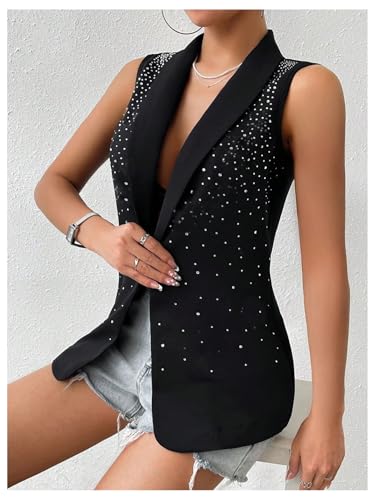 HOT ! MakeMeChic Women's Glitter Rhinestone Blazer Sleeveless Open Front Party Y2K Vests