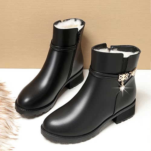 More information about Women'S Leather Low Block Heel Booties Fashion Round Toe Rhinestones Warm Fully Fur Lined Side Zipper Platform Snow Boots