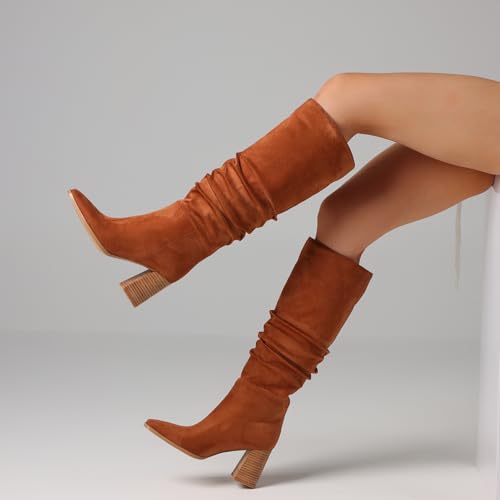 More information about mikarka Suede Knee High Boots Women Slouchy Tall Boots for Women Square Toe Chunky Block High Heel 2025 Fall Slip-On Long Boots